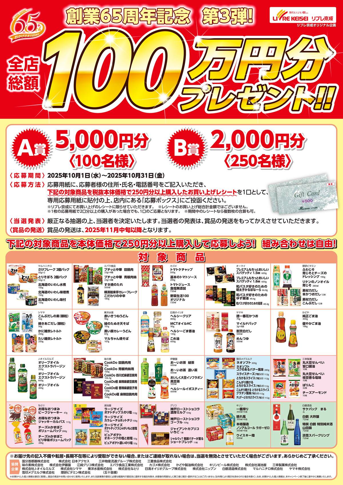 2025年10月 創業65周年記念 商品券総額100万円プレゼントキャンペーン(~10月31日まで)