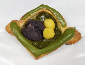 抹茶の風味豊かなクリームをのせて焼き上げた後、小倉あんと栗をトッピングして抹茶入りチョコで仕上げたサクサクのデニッシュです。
