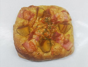 全粒粉入りの生地にカレーソースを塗りインカのめざめ、ベーコン、チーズをトッピングして焼き上げた調理パンです。