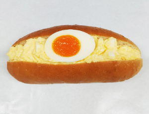 ドッグパンにタマゴサラダをたっぷりと入れて半熟風ゆで卵をトッピングした満足感のある1品です。